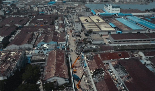 刚被龙卷风扫过的盛泽市区一片混乱,破坏带长达3公里。俯瞰画面中,房屋墙体断裂,屋顶被掀起,裸露出残缺不全的钢筋结构,厂房铁皮遭遇“肢解”,白色碎屑飘落在湖面上,有的工厂直接被夷为平地,变成一堆砖块。